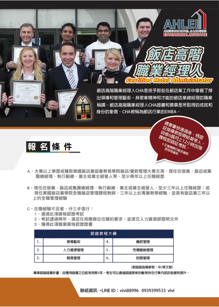 飯店高階職業經理人CHA是授予那些在飯店業工作中掌握了傑出領導和管理藝術、具敬業精神和才能的飯店業總經理的職業稱謂。飯店高階職業經理人CHA證書和徽章是所取得的成就和身份的象徵。CHA被稱為飯店行業的EMBA。報名條件需具備下列條件之一:A、大專以上學歷或獲取美國飯店業協會教育學院飯店/餐飲管理大專文憑,現任住宿業、飯店或集團總經理、執行副總、業主或業主經營人等,至少兩年以上任職經歷;B、現任住宿業、飯店或集團總經理、執行副總、業主或業主經營人,至少三年以上任職經歷;或現任美國飯店業學院全職飯店管理課程教師,三年以上此專業教學經驗,並具有飯店業三年以上的全職管理經驗;